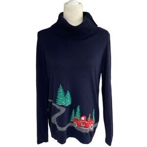 Talbots Womens Sweater Blue Christmas Holiday Red Truck Lambswool Blend Navy M