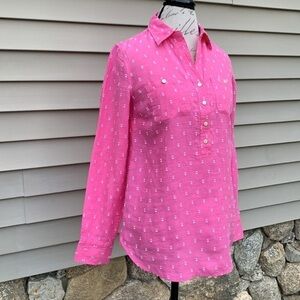 Pretty pink linen collared popover with white frayed embroidering throughout. Front button patch pockets. Double button barrel cuffs. Extra button attached.