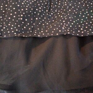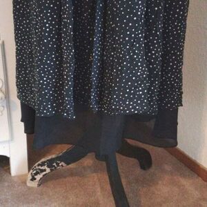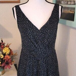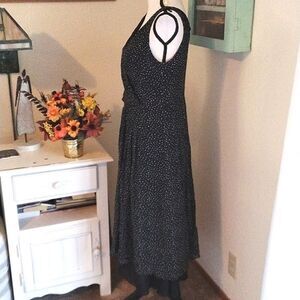 This pure silk dress is sprinkled with dots. Wrap front. Back zip. Bra friendly straps. Fully lined. The lining peeks our below the dress. Size 8 measures 36 at chest, 30 at waist, full skirt. 47 long to the bottom of the peekaboo lining. So pretty. Add a jacket for cooler weather.
