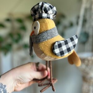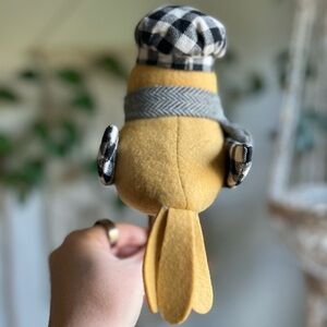 Adorable Target Wondershop 9-inch owl figurine, bundled up for the season in a black-and-white buffalo plaid cap and herringbone scarf. Features a golden felt body, cream face, burlap-textured belly, and sturdy wire-wrapped legs. A perfect mix of farmhouse charm and cozy cottagecore style, ideal for holiday or winter décor.