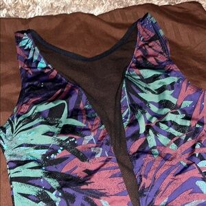 Dive into style with this Tavik Swimwear one-piece swimsuit featuring a captivating tropical print in shades of purple and green. The classic cut with thin shoulder straps and a scoop neckline offers a timeless look, while the vibrant colors ensure you stand out at the pool or beach. Featuring mesh detailing in the cleavage area for coverage and uniqueness, as well as a very low back that makes this one piece bathing suit extra sexy and feminine.