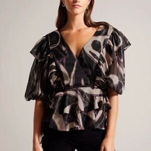 Ted Baker Jasmyna metallic purple tiered ruffled puff sleeve top.