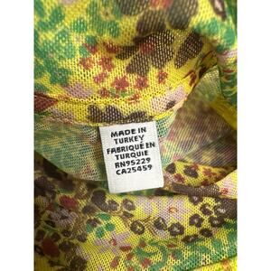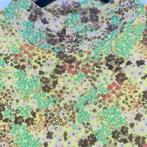 Ted Baker London women’s sheer floral mesh long sleeve top. Features a lightweight semi-sheer fabric with multicolor floral print in green, yellow, red, and brown tones. Designed with a mock neck and slim fit silhouette, perfect for layering or styling on its own. Size 3 (fits like US 8). Made in Turkey.