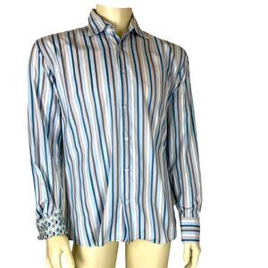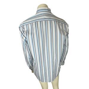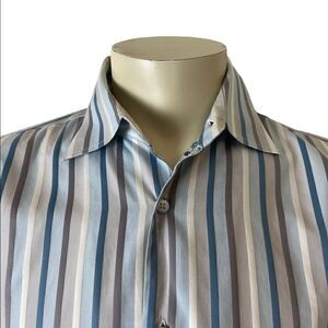 This gorgeous Ted Baker casual L/S button down is in like new condition, and features vertical stripes in light gray, dark gray, sky blue, colonial blue and white, with light blue mother-of-pearl buttons. The size 5 measures as follows: