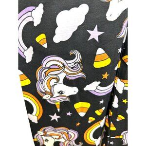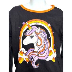 0169 B- The Children’s Place girls’ unicorn Halloween pajamas, size 12, snug fit, long sleeves, crewneck, ribbed wrist, 100%, cotton, graphic design, unicorn, stars, candy, corn, rainbows, clouds, black background, orange, yellow, white, lavender. Made in India. New with tags. Top has graphic design chest, bottom has allover print. Elastic waist band 1 inch wide. Banded ankle cuff 1.75 inch wide.