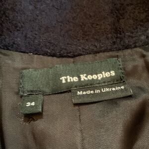 The Kooples moto biker coat in navy wool blend. Overlapping zip up front with foldover lapel. Double zipper front side pockets. Zipper detail at sleeve cuffs. Fully lined. Adjustable belt. Size 34 or XS per Kooples website. Excellent preowned condition. 82% wool 18% polyamide.
