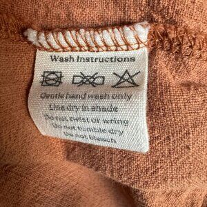 This Lounge Top From The Lullaby Club is constructed in breathable Cotton/Linen slub fabric in clay/ muddy orange. It features a V neckline, rounded oversized notch collar, button front closure, dolman bat wing long sleeves, 2 front patch pockets w/ rounded flaps and a boxy oversized silhouette. This is lounge. slouchy. boho, weekend, casual, travel, timeless, classic vibes.