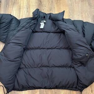 The North Face 1996 Retro Nuptse 700 Puffer Down Jacket Black Men's XXL Coat. **Has some white marks on collar and sleeve as shown in photos (not sure what it is; tried to wipe it off with cloth and water but then it comes back.) Also a small tear on sleeve (only goes through first layer of jacket.) No other flaws noted; refer to all photos for condition and sizing. Hood can be tucked into jacket.