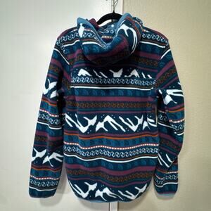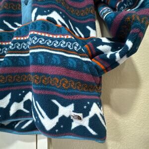 thenorthface, north face fleece, carbondale 1/4 snap, mountain print, summit navy, retro fleece, outdoor gear, recycled fleece, vintage style jacket, men’s small, hooded pullover, hiking fleece, eco conscious