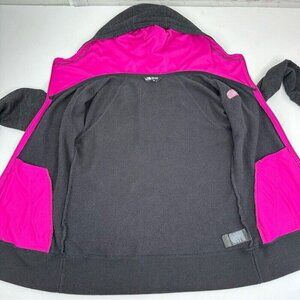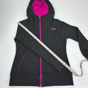 The North Face women's size medium, it is hooded, long sleeves, dark gray with accent pink, high neckline, front open slash pockets, comfy french terry fabric, stretchy with full zip closure. Materials body shell 53% cotton, 36% polyester, 11% viscose, cuff/hem 44% cotton, 29% polyester, 16% viscose, 11% elastane, lining 100% polyester. Care machine wash cold tumble dry low. Condition is preloved very good as shown in pictures. Please preview measurements to ensure fit.
