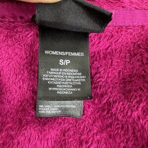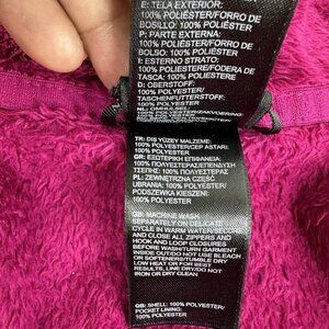 The North Face women's size small, it is a magenta pink color, stand up collar, full zip front, zip front hand warmer pockets, embroidered logo, insulating fleece, plush thick stretch fabric with comfortable stretch cuffs. Materials shell/lining 100% polyester. Care machine wash cold tumble dry low. Condition is preloved very good as shown in pictures. Please preview measurements to ensure fit.