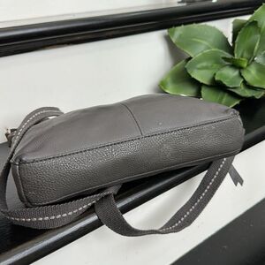 This Stylish gray leather crossbody is soft and luxurious to the touch and a great neutral color no matter the season. The Crossbody shoulder back has an adjustable strap that is comfortable to carry and can have an approximate 24 inch drop. The handbag has zipper pockets on each side that are perfect for organizing and also has the logo name in Silvertone lettering that matches the hardware on the purse. The top of the bag has a strong and secure zipper and opens to a signature teal clean lining inside. There is a zipper pocket and two open pockets for organizing as well as lots of room for all your things. The leather on this bag is smooth and soft to the touch. Non-smoking and a great neutral no matter the season. The bag measures approximately 12 inches across and stands approximately 9 1/2 inches tall. The base of the bag is approximately 2 inches wide. Perfect for everyday use.