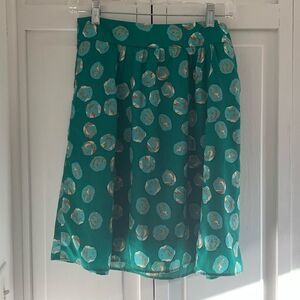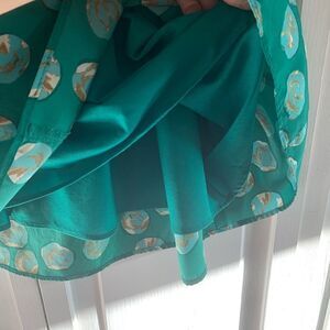 So cute! Perfect for spring or summer in the office, or a nice teacher style! EUC. No signs of wear or flaws. I would describe it as a slightly darker jelly green, with turquoise blue dots, that have a small amount of tan and white in them. Flowy. My normal size is a small or 2-4, and this fit me around my natural waist. Measurements are almost 14 inches and the length is 20 inches in the front and 21 in the back.