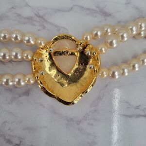 Vintage 3 Strand faux pearl necklace with large pendant. The pendant is gold toned with large teardrop baroque shaped faux pearl surrounded by rhinestones and peach enamel design. Faux pearls on the necklace are fairly heavy. Short length lays close to the neckline.
