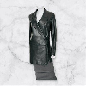 Multiple style options. Inside fabric strap with 2 snap closures provides options for wear: Draped, or closed for a sculpted fit. Not faded, reflections of light on black leather (by design.) leather has soft patina from wear actually enhancing appearance in my opinion Belgium size 40 USA 6/8/10 Bust/Bra 34/36 A/B/C Length is 33" Shoulders 15 12"- 17"-- Shoulders have flexibility depending on how jacket is worn. Waist 26-27 worn open. Draped 30" Sleeves 24" Deep front, flat pocket. Is part of exceptional Personal Vintage Collection.