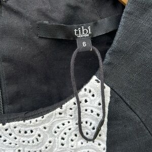 Tibi New York Carey Cap Sleeve Embroidered Linen Dress Black With White Eyelet Lace Sz 6 in Excellent Pre-Owned Condition.