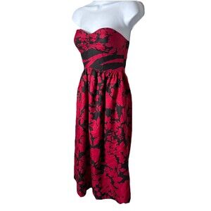 Capture attention in this stunning Tibi New York strapless cocktail dress. Featuring a rich red and black floral pattern woven into a luxurious silk and wool blend fabric. The elegant strapless neckline and cinched waist create a flattering silhouette, while the A-line skirt falls to a chic midi length. Perfect for weddings, galas, cocktail parties, or any special occasion.