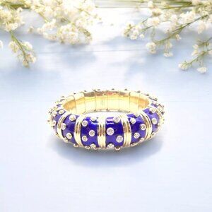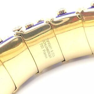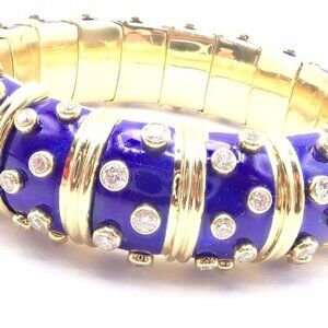 The Tiffany & Co Schlumberger Dots Bangle Bracelet features 18k yellow gold adorned with round brilliant diamonds and vibrant blue enamel.
