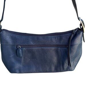 Tignanello Navy Leather Adjustable Strap Silver Color Hardware Zip Shoulder Bag