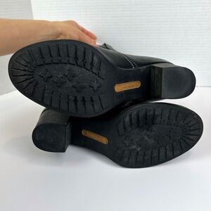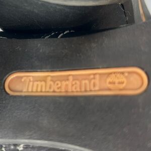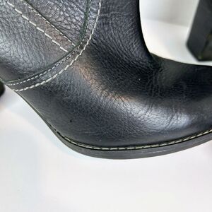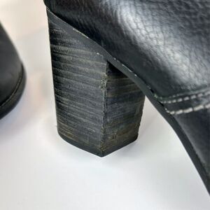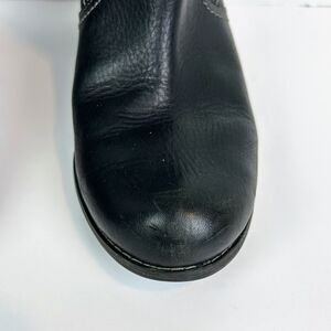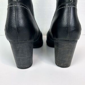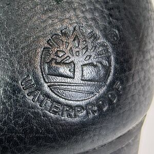 Timberland Rudston Heeled Pull On Boots in black waterproof pebbled leather. Classic black riding style knee high boots with Y2K inspired white stitch detail, slightly rounded toes, and block heels. Made with Earthkeeper soles for all day comfort. Approximately 3" heel height, 12.5" shaft height. Women's size 8.5. Very good used condition - final photos show slight scuffs to toes, one side scuff, and wear to inside corner edges of heels.