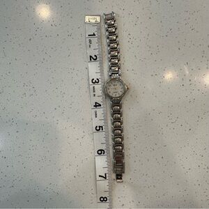 Elegant Timex Carriage Indiglo watch with a silver band and white face. Water resistant to 30 m. Perfect for any occasion. Great used condition—NEEDS A NEW BATTERY! Measurements included in photos.