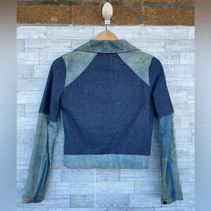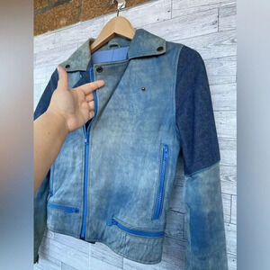 lightweight this 2014 collection This Carrie Biker Jacket is a denim and leather motorcycle biker rider jacket multi-panel hybrid factory distressed have the dirty distressed look
