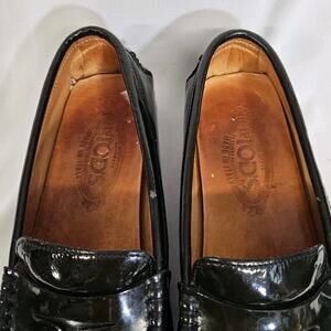 Tods Italy Dark Green Patent Leather Penny Loafers Size 41. Good pre-owned condition with some signs of wear including mild wrinkling of the toe box and a small tear/crack in the edge on one side of each shoe. See photos for details of condition