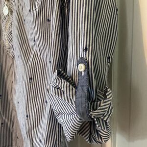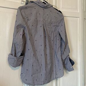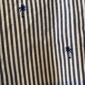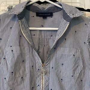 Tommy Hilfiger 1/2 zip blouse - Palm Trees - Size XS. 100% cotton - Blue and white preppy stripes. Palm Tree print on top of the stripes.