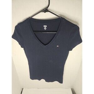 Tommy Hilfiger Shirt Womens Size Small Blue Short Sleeve Tee Casual V Neck Logo