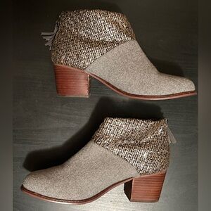 These. booties. are. so. comfortable. AND CUTE! the memory foam soles make you feel like youre walking on clouds. The grey wool mixed with the metallic boucle makes for such a unique look.