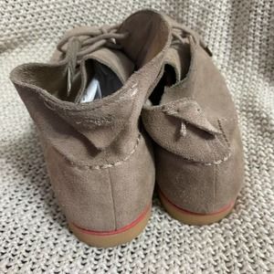 Simple and cute Tom’s ankle boots made of suede. Lace up tie front and slightly above ankle. Stitch work on top of foot and around heel. Boots are super soft and like new.