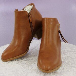 Chic and versatile, these Top Moda Zanora-38 ankle booties are the perfect addition to any wardrobe. Crafted in smooth tan faux leather, they feature a side zipper with a tassel pull for easy wear and a stacked block heel that provides both comfort and style. The sleek pointed toe design adds a polished finish that pairs beautifully with jeans, skirts, or dresses.
