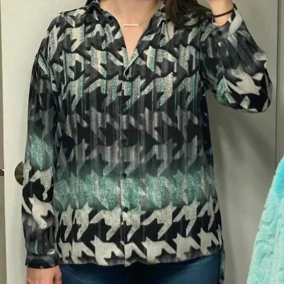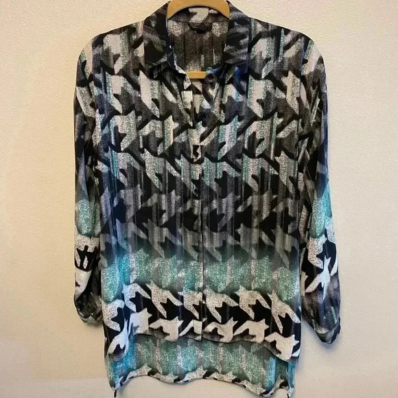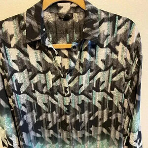Topshop button down top with cute print. Long sleeve. Size 4 but fits more like a size 6-8. In great shape.