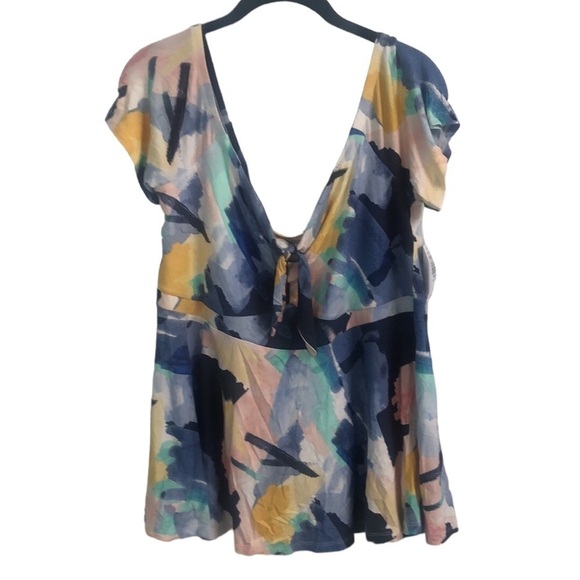 Top features an off the shoulder design, round neck, keyhole tie front with an abstract multi-color brush stoke pattern. Peplum hem. Cap sleeves.