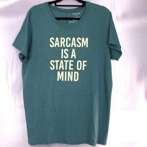 Add some humor to your everyday style with this Torrid “Sarcasm Is a State of Mind” tee. Crafted from soft 100% cotton in a flattering classic fit, this teal graphic top is lightweight, breathable, and easy to pair with jeans, leggings, or shorts. Features short sleeves, a crew neckline, and bold cream lettering across the front.