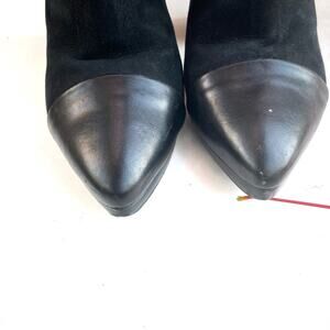 Details: Suede + leather upper, leather sole, gold-tone zip pull, 3.75” block heel, made in Brazil.