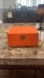 Stylish orange box featuring a gold Tory Burch emblem. Perfect for storage or decor.