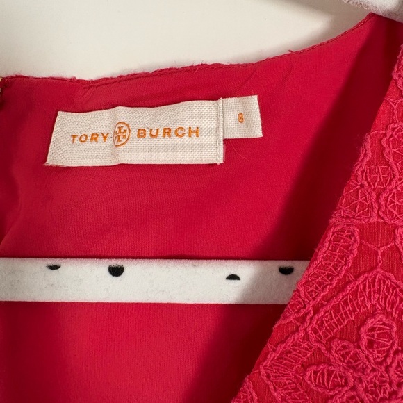 This beautiful Tory Burch statement dress is perfect to dress up or wear to work. Embroidered lace is cut into this fitted sheath, finished with a v-neck and a Scalloped-edge hem. In like new condition with no callouts. Size 8.