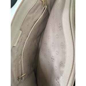 The Tory BURCH Leather Shoulder Bag is a stylish and spacious accessory for women. Made from beige leather, this large shoulder bag features a zip closure and double beige leather handles. The gold hardware adds a touch of elegance, while the beige leather lining provides a chic contrast. With a sleek design and practical size, this Tory Burch bag is perfect for everyday use or special occasions.