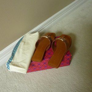 Tory Burch Georgia Brown Leather Logo Sandals, 8.5 (NEW IN BOX)