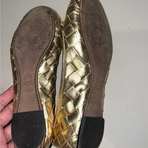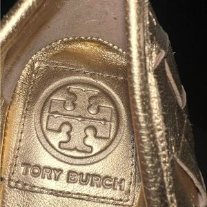 These Tory Burch flats feature a luxurious metallic gold finish with a quilted texture, offering both style and comfort. The classic round toe design is complemented by a charming bow detail on the toe, making them perfect for everyday wear. Crafted with a focus on elegance, these flats are a versatile addition to any wardrobe.