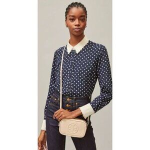 The iconic double-T medallion is stamped at the front of this sized-down bag crafted of richly pebbled leather in classic and Tory's new swoon-worthy colors.