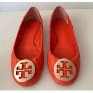 Tory Burch Size 6.5 Minnie Quilted Leather Ballet Flats Orange Gold Logo Travel