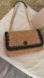 Stylish woven design. Features black trim. Gold chain strap. Iconic logo detail.