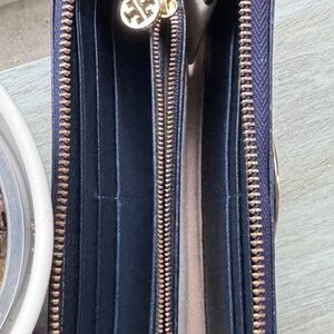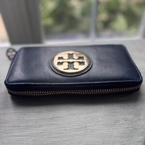 Tory Burch black/navy zippered long leather wallet w/ coin section & dustbag EUC