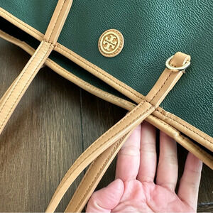 Coated canvas in dark green color, genuine leather trim. Gold Tory Burch logo.