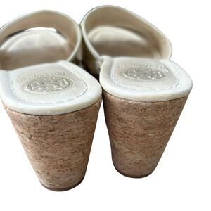 These are in good condition!  They are very comfortable and flattering. Cork wedge.  Patent leather.