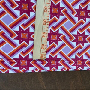 Beautiful Tracy Negoshian geometric pattern dress with elbow length sleeve. White background with orange and raspberry. Sz Medium EUC 37” long