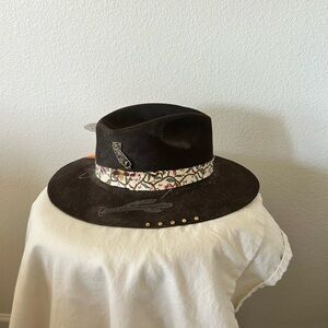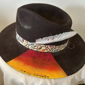 features: feather, paint on brim, “cali dream’n” on brim, floral pattern present