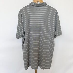 Keywords: Travis Mathew, gray polo, men's XL, short sleeve, breathable, casual wear, striped pattern, collared shirt, button closure, logo detail, machine washable, pre-owned, comfortable fit, polyester, pima cotton.